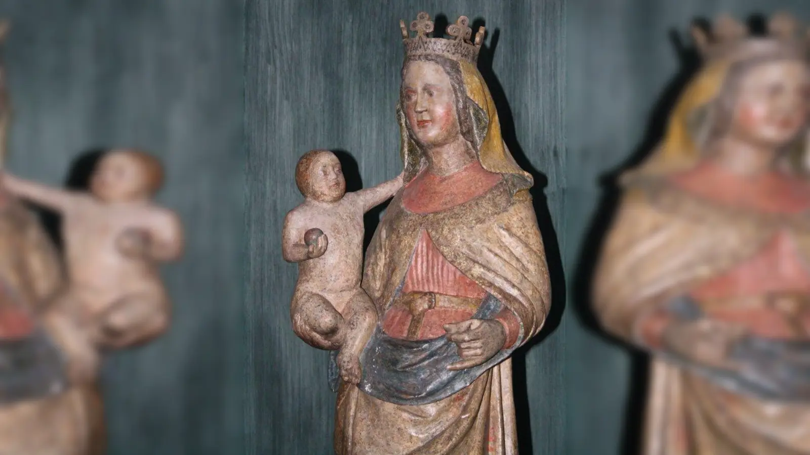 Die Madonna stand bereits in der ersten Notkirche, ist aber viel, viel älter als diese: Die fast einen Meter hohe geschnitzte Figur stammt aus der Zeit um 1450. Wer sie damals geschaffen hat, ist nicht bekannt.
