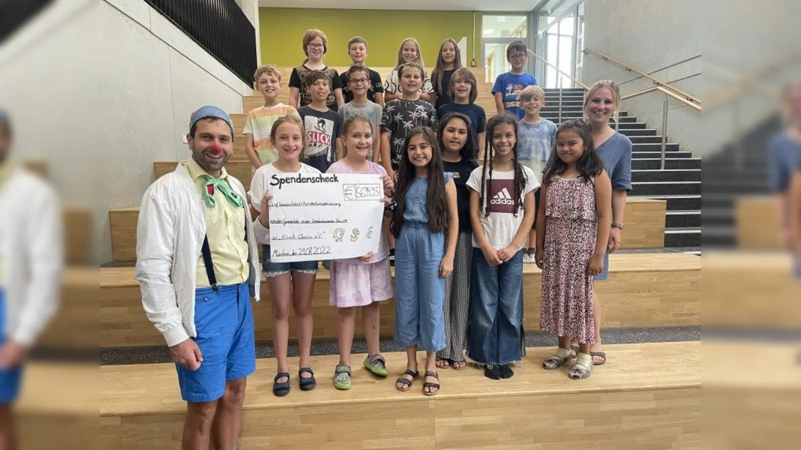 Genau 5.694,95 Euro haben Schülerinnen und Schüler der Grundschule an der Schrobenhausener Straße für die KlinikClowns erlaufen. Rund 400 Kinder gaben ihr Bestes – und das für eine gute Sache. Sie hatten sich Unterstützer in den Familien und im privaten Umfeld gesucht, die ihre Laufleistung mit Spenden belohnten. Die Hälfte der großzügigen Spenden kommen der Arbeit der KlinikClowns zu Gute, mit der anderen Hälfte unterstützt der Elternbeirat Projekte der Schule. KlinikClown „Dr. Batscho”, der bereits beim Lauf dabei war, besuchte die Grundschule und freute sich sehr, als ihm die Mädchen und Buben einer vierten Klasse die tolle Spende überreichten. Er bedankte sich herzlich im Namen des Vereins KlinikClowns Bayern e.V., denn nur mit Hilfe von Spenden ist es möglich, dass mittlerweile 70 professionelle Clowns des Vereins Kindern im Krankenhaus die schwere Zeit mit ihren Besuchen erleichtern. Ausführliche Informationen über die KlinikClowns und sämtliche Kliniken, pflegende und therapeutische Einrichtungen, in denen sie regelmäßig im Einsatz sind, findet man unter www.klinikclowns.de im Internet.