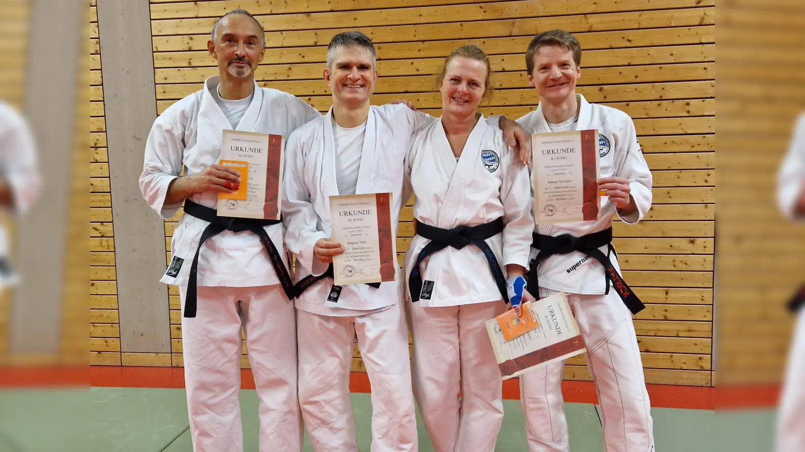 Die Germeringer Ju-Jutsuka waren nicht nur in den Prüfungskommissionen vertreten. Mit Sandra Aigner, Patrick Nieveler, Magnus Tölle und Ralf Dietrich haben vier Germeringer Ju-Jutsuka die Prüfung zum 3. Dan erfolgreich gemeistert. Am Sonntag traten dann noch vierzehn Anwärterinnen und Anwärter zum 1. Dan in zwei Prüfungsgruppen an; elf von ihnen konnten mit dem ersehnten schwarzen Gürtel die Heimreise antreten.