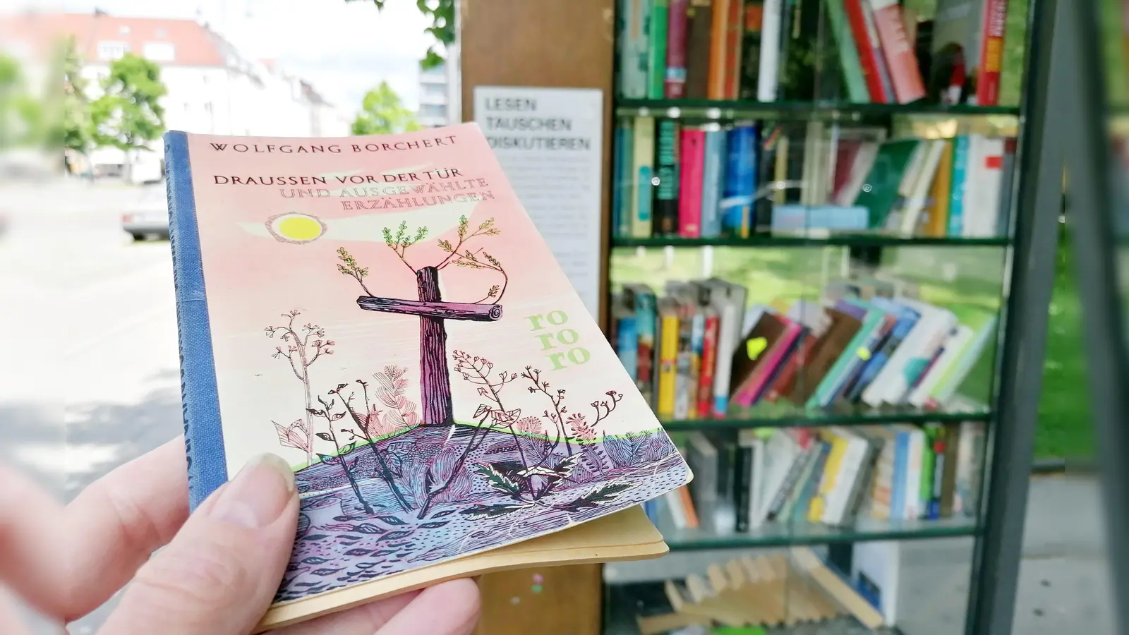 Die Borchert-Ausgabe aus dem Bücherschrank am Nordbad stammt von 1956 und ist laut Geleitwort „vor allem für jene bestimmt, welche jetzt so alt sein mögen wie Wolfgang Borchert war, als er zum ersten Mal in den Kerker geworfen wurde“. Das sind die, die heute „Erstwähler“ sind und Krieg glücklicherweise nur aus PC-Spielen oder dem Fernsehen kennen und seine Folgen gar nicht.