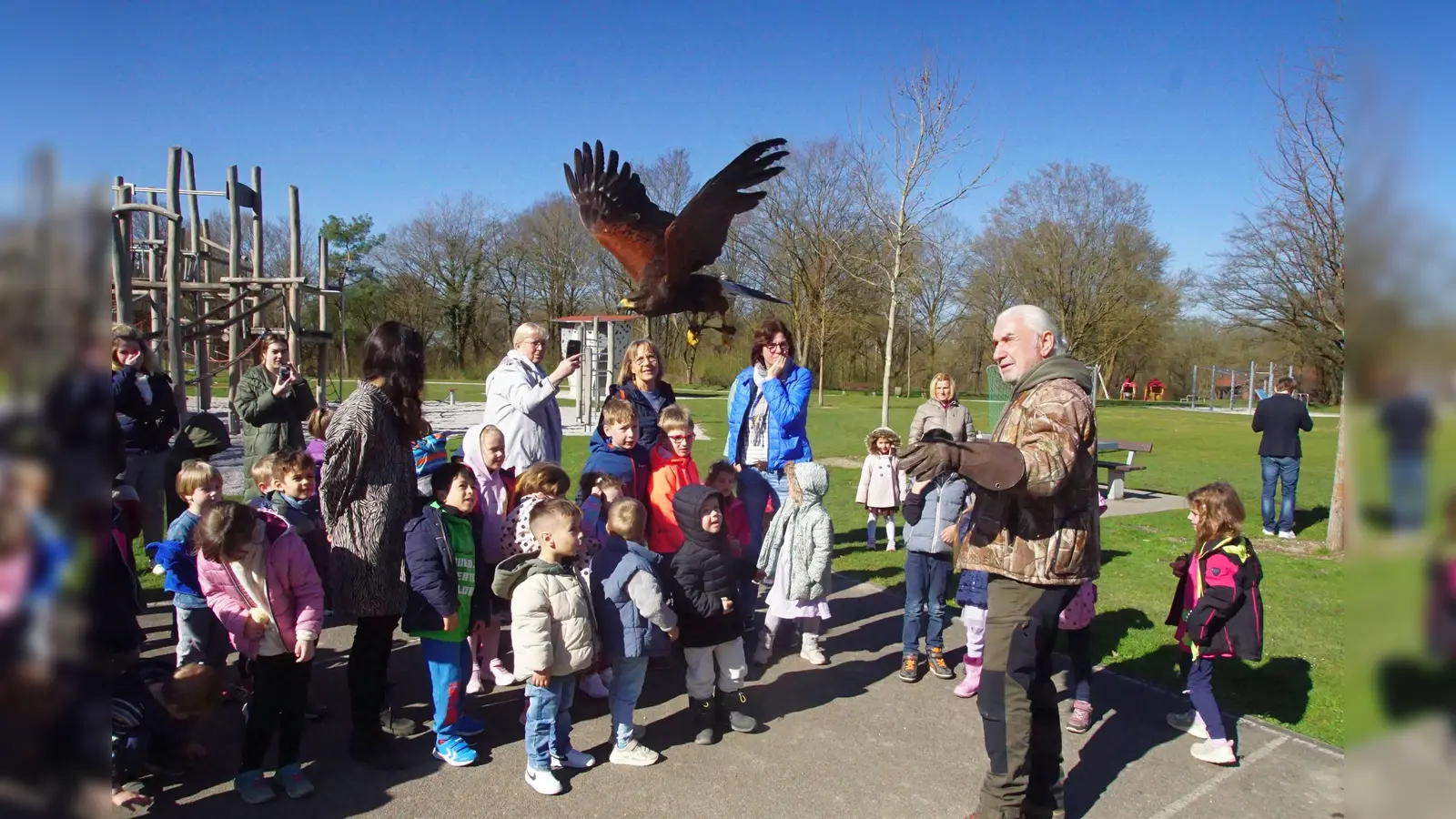 Heute ist der Falkner mit seinen Bussarden Fips und Zora sowie Falknerin Tini beim Kindergarten Sternschnuppe. Dort arbeitet Kindergärtnerin Lisa, auch eine Falknerin. Völlig fasziniert sehen die 100 Kinder samt Bürgermeister Thaler, wie die Bussarde den Falknern auf Pfiff folgen. Die großen Vögel schweben über die Kinder, landen auf deren Kopf oder Arm, wenn es der Falkner will. Alle Kinder wollen die faszinierenden Tiere natürlich streicheln.