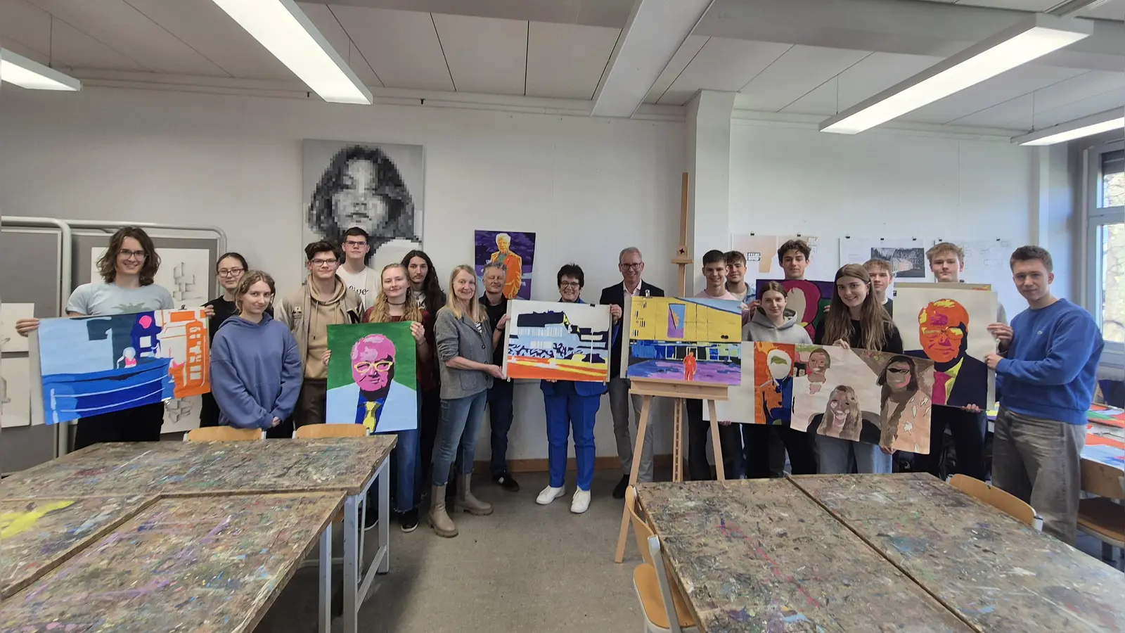 Kurz vor den Osterferien zeigte die Klasse 11d des Otto-von-Taube-Gymnasiums zusammen mit Lehrerin Swantje Munzert und Schuldirektor Alexander Schröder der Bürgermeisterin Dr. Brigitte Kössinger und Sebastian Hofmüller aus dem Rathaus ihre teils bereits fertigen, teils im Entstehen begriffenen Kunstarbeiten. Insgesamt 16 Plakate im PopArt-Stil mit Gautinger Motiven und Persönlichkeiten haben sich die Schülerinnen und Schüler anlässlich des Jubiläums vorgenommen.