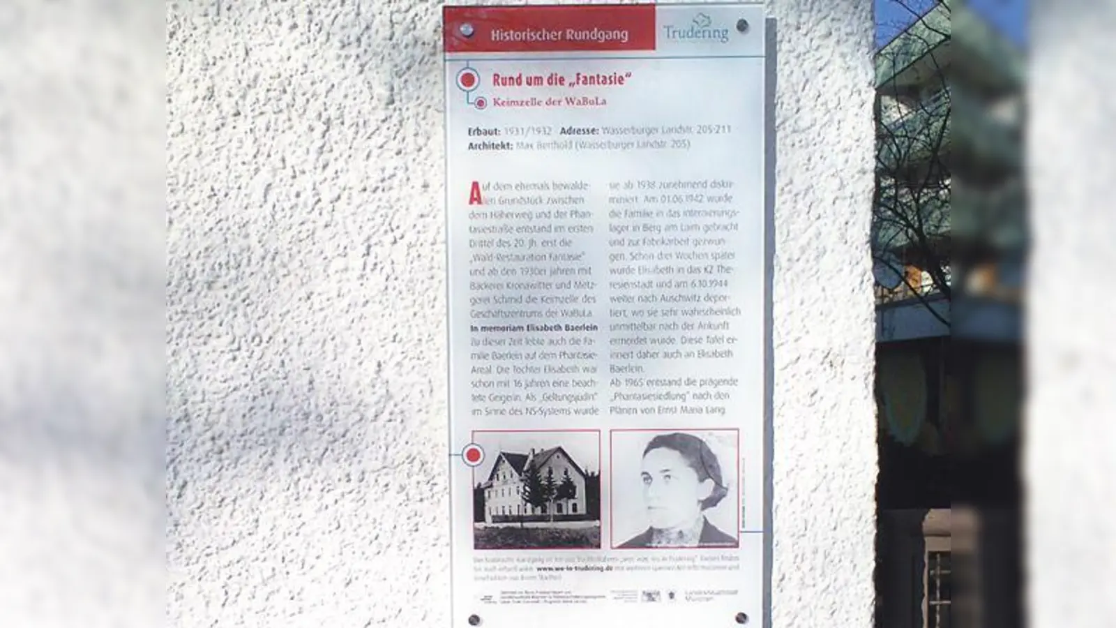 Die Radlführung wird auch Station an der neuen Haustafel am Anwesen Wasserburger Landstraße 207 machen, die die Geschichte »rund um die Fantasie« erzählt und vor allem auf das Schicksal der jüdischen Familie Baerlein hinweist. Seit kurzem ist in Riem eine Straße nach der 1944 in Auschwitz ermordeten Tochter Elisabeth Baerlein benannt. Ihr Pioniergeist spiegelt sich auch in Straßennamen deutscher Kolonialzeit. Waldtrudering gilt seit Jahrzehnten als bevorzugtes ohngebiet und »Gartenstadt«, teilt aber auch deren heutige Probleme, wie insbesondere die bauliche Verdichtung und Explosion der Immobilienpreise.