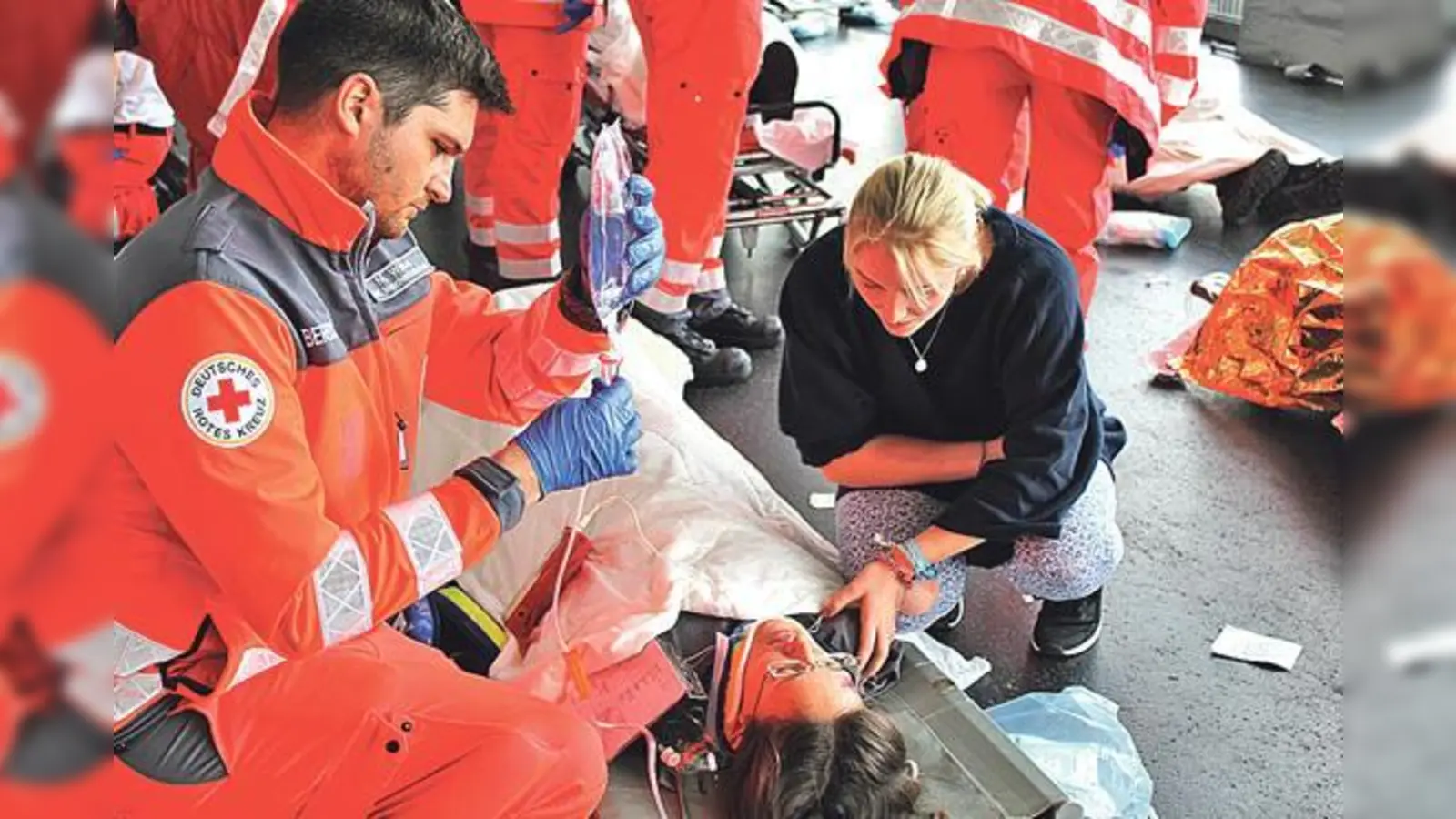 Die Fans geraten in Panik, 48 werden zum Teil lebensgefährlich verletzt, einer stirbt. »Neben den unmittelbaren Verletzungen durch die Explosion sind bei so einem Ereignis vor allem auch Patienten mit stumpfen Traumata durch die Massenpanik zu erwarten«, erklärt Dr. Philipp Groha, stellvertretender Chefarzt des Münchner Roten Kreuzes und bei der Übung Leitender Notarzt. Die Mimengruppe hat die Verletztendarsteller entsprechend täuschend echt geschminkt und auf ihre Rolle vorbereitet.
