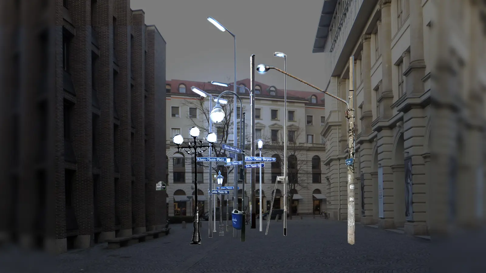 Das von ihm entworfene Denkmal besteht aus einem Arrangement aus zirka 15 Straßenleuchten und daran befestigten Schildern. Die Leuchten stammen aus Orten, die von der Exilgeschichte der Familie zeugen. Die Straßenschilder verweisen auf Straßen und Plätze, die nach Mitgliedern der Familie Mann benannt sind. Die Wirkungsstätten und Stationen von Thomas Mann, seiner Frau Katia und ihren gemeinsamen Kindern Klaus, Erika, Golo, Elisabeth, Michael und Monika Mann finden hier zusammen. Leuchten aus Los Angeles, Nida (Litauen), São Paulo oder Rom werden mit jeweils einem Straßenschild künstlerisch auf dem in der Ausschreibung vorgegebenen sieben mal drei Meter großen Korridor auf dem Salvatorplatz arrangiert.