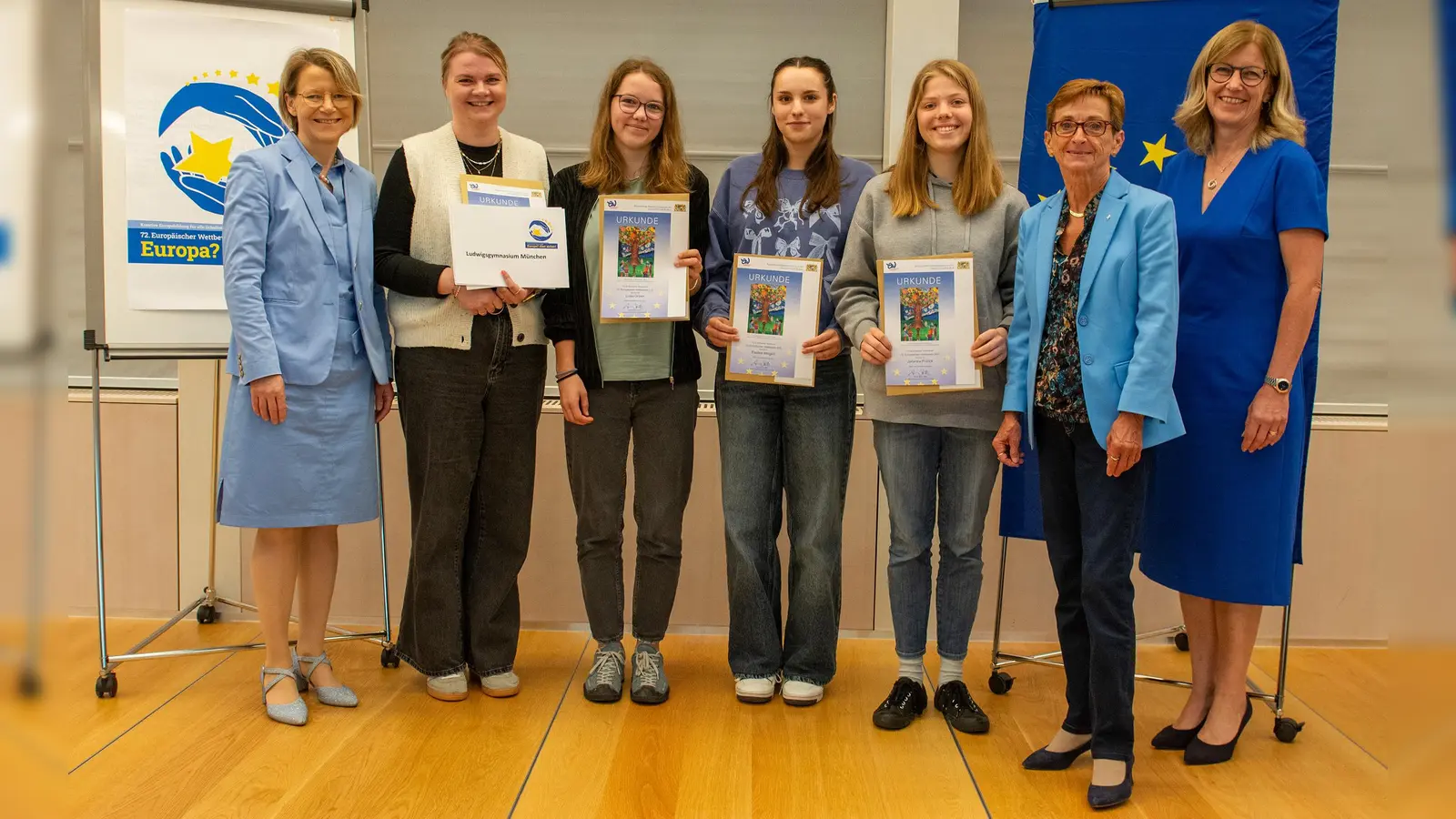 186 Schülerinnen und Schüler aus Oberbayern zählen zu den diesjährigen Siegerinnen und Siegern des Europäischen Schülerwettbewerbs, der unter dem Leitmotiv „Europa? Aber sicher!“ steht. Sie haben sich auf besonders kreative Weise künstlerisch mit der europäischen Idee auseinandergesetzt. Die weitere stellvertretende Bezirkstagspräsidentin Friederike Steinberger und Anne Radlinger, Leiterin des Bereichs Schulen bei der Regierung von Oberbayern, würdigten die Arbeiten der Gewinnerinnen und Gewinner mit Urkunden und Buchgutscheinen.