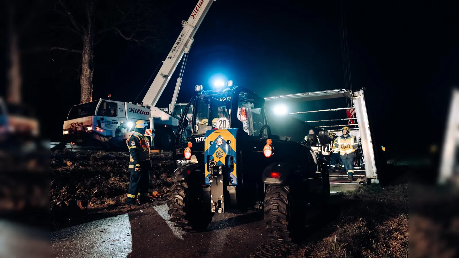 In der Nacht auf Samstag (15. März) wurden die Feuerwehren aus Haimhausen und Unterschleißheim sowie die Kreisbrandinspektion kurz vor Mitternacht zu einem schweren Verkehrsunfall mit eingeklemmter Person auf die B 13 oberhalb des Maisteiger Bergs alarmiert. Beim Eintreffen an der Einsatzstelle fanden die Rettungskräfte einen umgekippten Sattelzug zwischen den Abfahrten Deutenhausen und Günzenhausen vor. Das Gespann war aus von der Fahrbahn abgekommen und auf dem Fahrradweg neben der Bundesstraße umgestürzt. Entgegen der ersten Meldungen war der LKW-Fahrer jedoch nicht eingeklemmt, sondern in seinem Führerhaus eingeschlossen. Durch den koordinierten Einsatz der Rettungskräfte konnte er schnell über die Frontschreibe befreit und dem Rettungsdienst übergeben werden. Glücklicherweise erlitt er nur leichte Verletzungen und wurde zur weiteren Behandlung in ein Klinikum eingeliefert. Während die Kräfte der Feuerwehr Unterschleißheim nach der Personenrettung aus dem Einsatz entlassen werden konnten, verblieb die Feuerwehr Haimhausen an der Unfallstelle, um Ausleucht- und Absperrmaßnahmen durchzuführen. Die Bergung des LKW stellte sich als äußerst aufwendig heraus. Der Sattelauflieger war mit Fahrzeugteilen in schweren Gitterboxen beladen, weshalb ein direktes Aufrichten des Sattelzugs nicht möglich war. Um eine sichere Bergung zu gewährleisten, musste der Auflieger zunächst entladen werden - hierzu wurde das THW Dachau nachalarmiert. Mit Unterstützung eines Teleskopladers gelang es den Einsatzkräften nach etwa drei Stunden die Entladung durchzuführen. Erst danach konnte der angeforderte Autokran in Aktion treten und das umgestürzte Gespann aufrichten. Insgesamt waren rund 40 Feuerwehrkräfte sowie 25 Einsatzkräfte des THW im Einsatz, gegen 8.15 Uhr konnte Einsatzende Feuerwehr gemeldet werden und die Schadensstelle an die Straßenmeisterei übergeben werden. Während der Rettungs- und Bergungsarbeiten musste die B 13 für den Verkehr gesperrt werden.