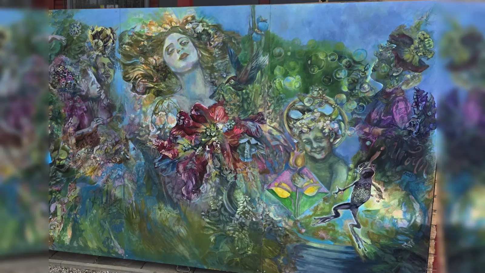 Das Werk mit dem Titel „Flora mit Münchner Kindl“ (Acryl auf Birkenholz, 166 × 276 cm) zeigt die römische Göttin des Frühlings als lebensfrohe Symbolfigur der Erneuerung – eingebettet in eine üppige Pflanzenwelt, aus der heraus ihr das Münchner Kindl eine Tulpe überreicht. Die Szene ist versponnen und verspielt, zugleich aber tief verwurzelt in der Geschichte des Ortes: Die Tulpe stammt aus dem Vereinslogo, die Naturmotive aus dem angrenzenden Westpark. Entstanden ist ein Werk, das Mythologie, Lokalbezug und Naturerfahrung miteinander verbindet.