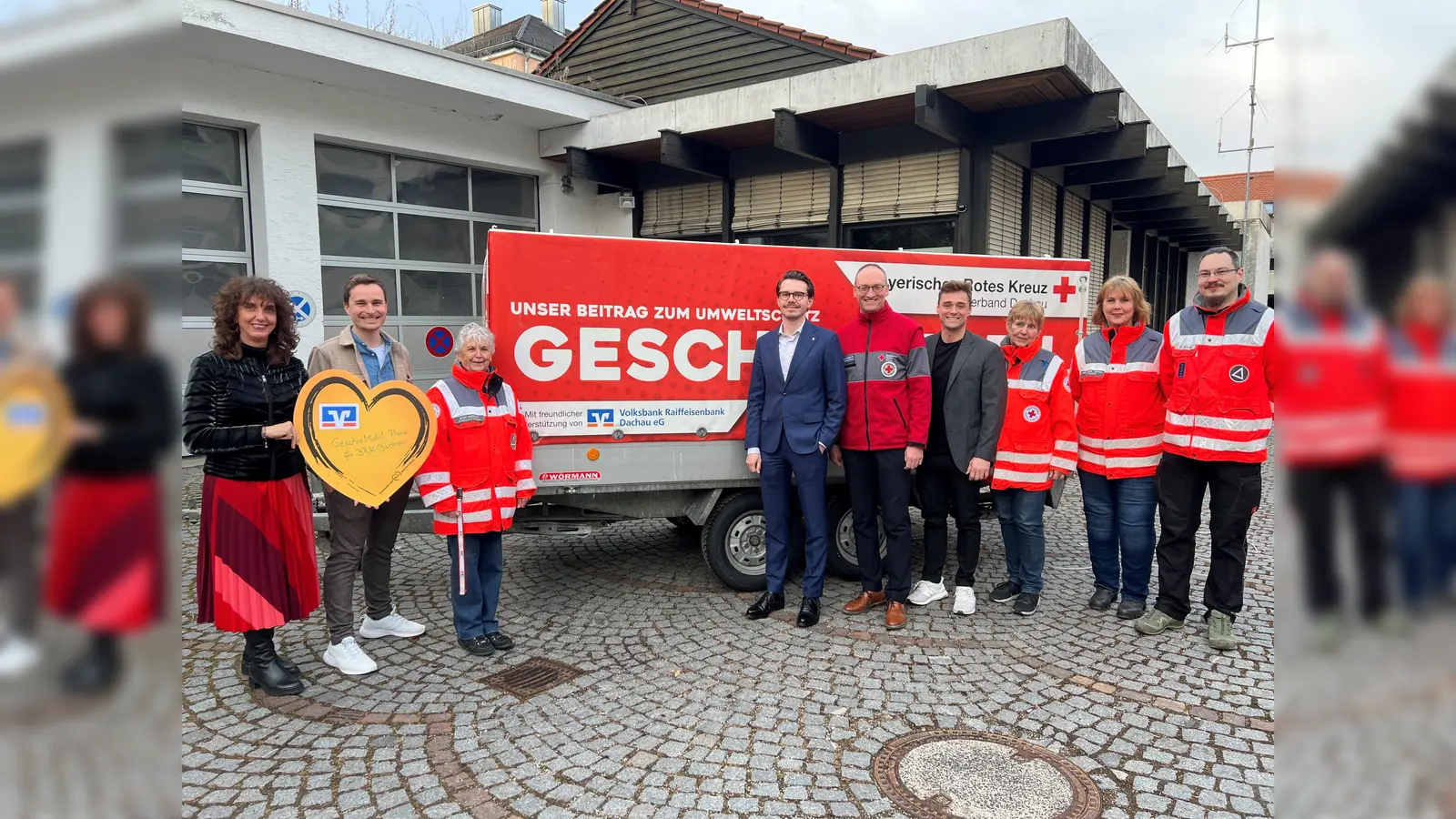 Die Volksbank Raiffeisenbank hat 2.900 Euro für die wasserdichte Plane gespendet. Marketing-Referentin Michaela Steiner überreichte an Max Frisch, Bereichsleiter Lokale Dienste & Service, den symbolischen Scheck. Voller Stolz präsentierte die Beauftragte der Gemeinschaft Wohlfahrts- und Sozialarbeit und stellvertretende Kreisvorsitzende, Angelika Gumowski, mit ihremTeam aus Petra Holzner, Gudrun Boer und Dominic Ladewig nun das propere Geschirrmobil.